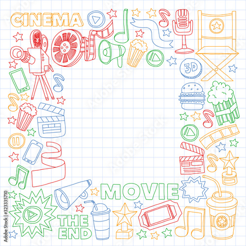 Movie, cinema set. Pattern doodle background with vector icons. Video TV.