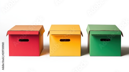 Moving boxes in vibrant colors arranged in a minimalistic studio setting