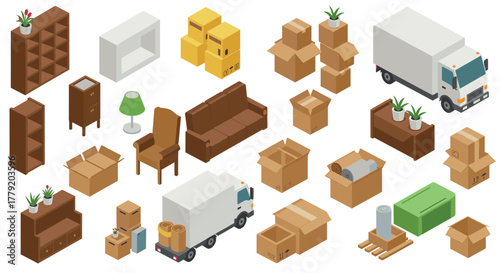 Moving day essentials in isometric style boxes, furniture, and delivery trucks