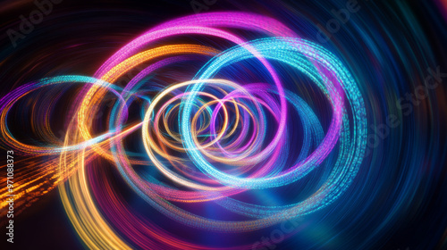 Moving lights create colorful, blurry circles. The effect is like a swirling trail of light, made by taking a long exposure photo. It's a 3D rendering of light painting.