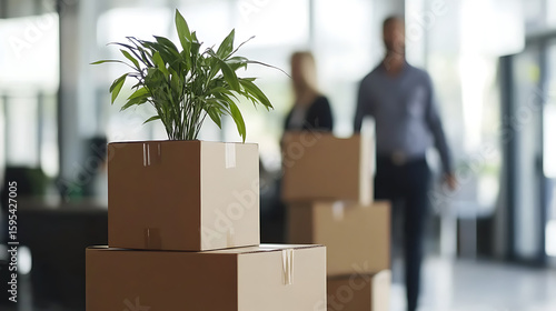 Moving office: boxes with a plant on top are stacked, while employees carry other boxes in the background. A fresh start in a new location.
