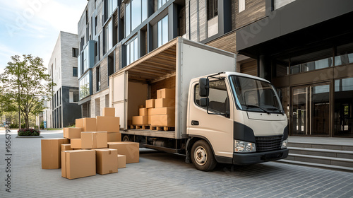 Moving truck filled with cardboard boxes packed outside a modern building, ready for moving to new office. Delivery service, Moving or shipping concept