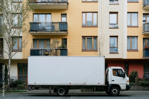 Moving truck parked outside a bright new apartment building in the city. Generative AI