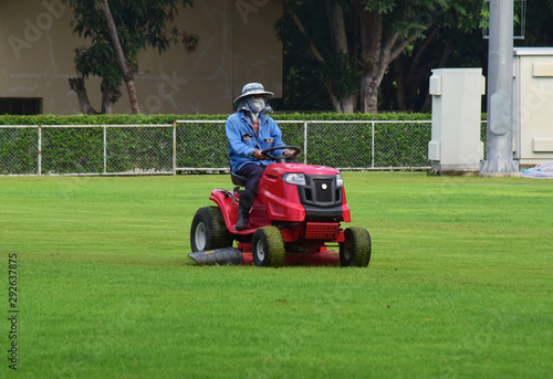 Mower and with a driver to take care of mowing in The football stadium always looks