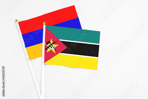 Mozambique and Armenia stick flags on white background. High quality fabric, miniature national flag. Peaceful global concept.White floor for copy space.