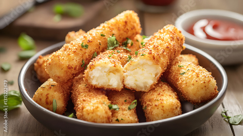 Mozzarella sticks air-fried to crispy golden perfection with a cheesy center, offering a guilt-free, low-fat, healthy version of a classic favorite snack.