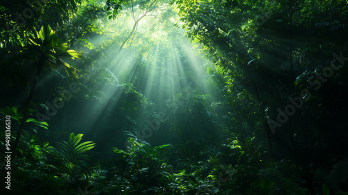 Mroczny, tropikalny las deszczowy z słonecznymi promieniami wnikającymi przez gęste korony drzew tworzy niesamowity efekt świetlny.