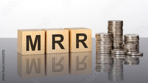 mrr - text on wooden cubes on a cold grey light background with stacks coins