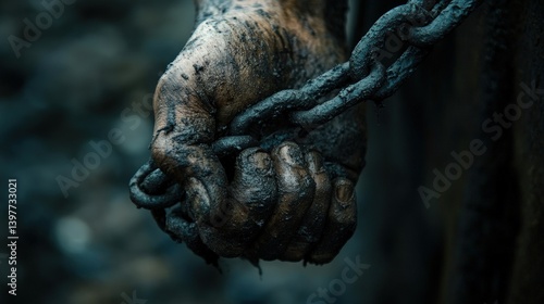 Mud-caked hand grips a chain, hinting at a dark, untold story. Mysterious and evocative close-up