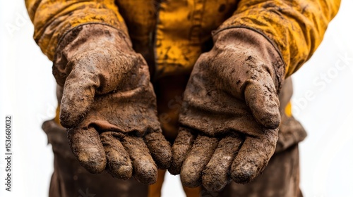 Muddy work gloves outstretched