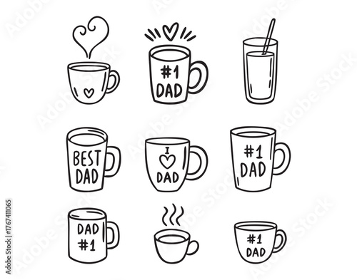Mug set for fathers day Dad number 1 I love Dad Best Dad, hand drawn doodle line art monochrome hand drawn