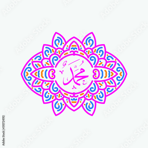 Muhammad arabic calligraphy. Mawlid al-nabawi al-shareef greeting card template with frame or ornament