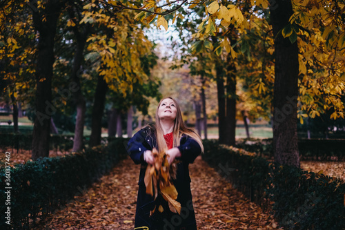 mujer atractiva pelirroja tirando al aire hojas otoñales en sus manos haciendo desenfoque con la cámara