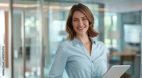 Mujer joven empresaria sonriente sosteniendo una tablet en su mano, sobre fondo desenfocado de la oficina de su empresa