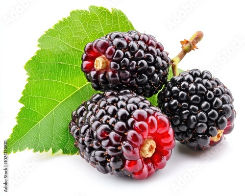 Mulberries. Closeup of Fresh Ripe Red Mulberries with Leaves on White Background