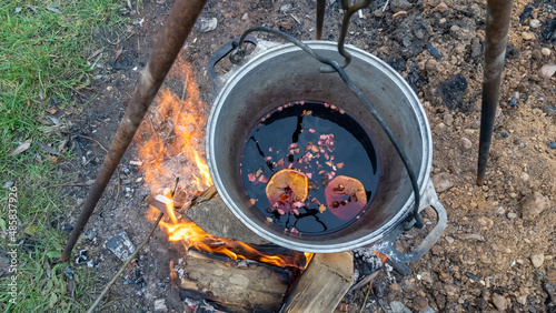 Mulled wine in a tourist pot over hot camp fire. Mulled wine by the fire. Mulled wine cooked on fire outdoors. Picnic.