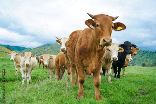 multi colored red brown black white beef cattle graze on green pasture. Herd of cows in green field.