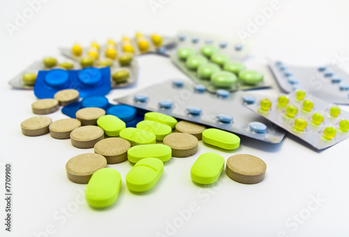 multi coloured pills on white background