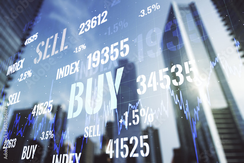 Multi exposure of abstract financial diagram on office buildings background, banking and accounting concept