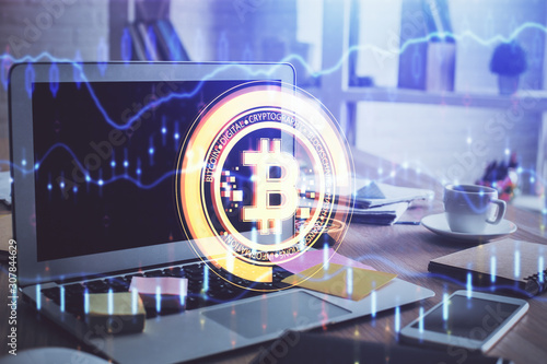 Multi exposure of blockchain theme hologram and table with computer background. Concept of bitcoin crypto currency.