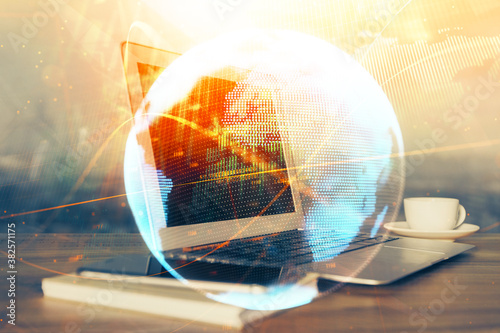 Multi exposure of business theme icons and table with computer background. Concept of success.