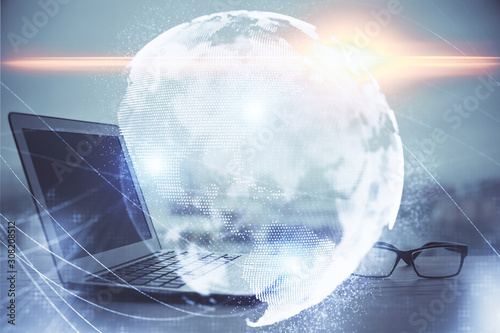 Multi exposure of business theme icons and work space with computer background. Concept of success.