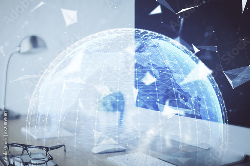 Multi exposure of business theme icons and work space with computer background. Concept of success.