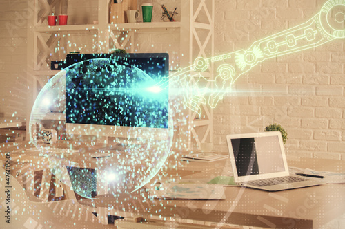 Multi exposure of data theme drawing and office interior background. Concept of technology.