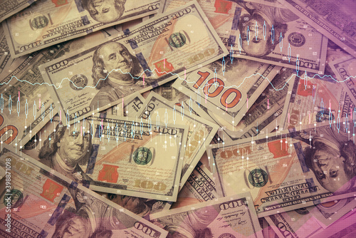 Multi exposure of forex chart drawing over us dollars bill background. Concept of financial success markets.