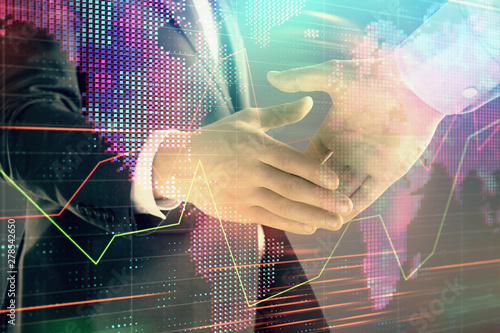 Multi exposure of forex graph and world map on abstract background with two businessmen handshake. Concept of success on international markets