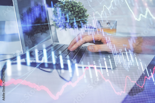 Multi exposure of graph with man typing on computer in office on background. Concept of hard work. Closeup.