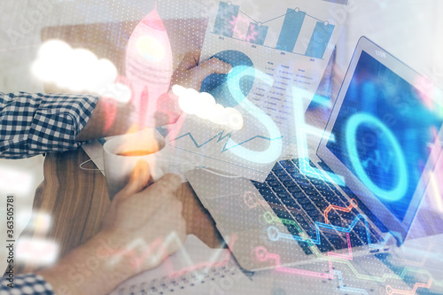 Multi exposure of seo icon with man working on computer on background. Concept of search engine optimization.