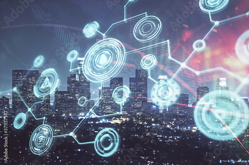 Multi exposure of social network theme drawing and cityscape background. Concept of people connecton.