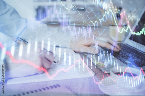 Multi exposure of stock market graph with man working on laptop on background. Concept of financial analysis.