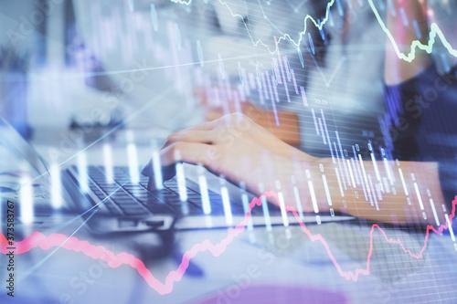 Multi exposure of woman hands typing on computer and financial graph hologram drawing. Stock market analysis concept.