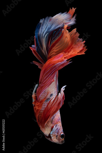 Multi-color Betta splendens gracefully swimming down against a black background creates an enchanting and dynamic scene.