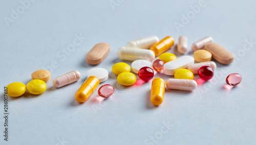 Multicolor vitamins and supplements on bright paper background. Concept for a healthy dietary supplementation. Copy space.