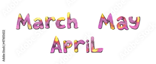 Multicolor Watercolor set lettering March, May and April month with blot on white background. Spring pink and yellow color