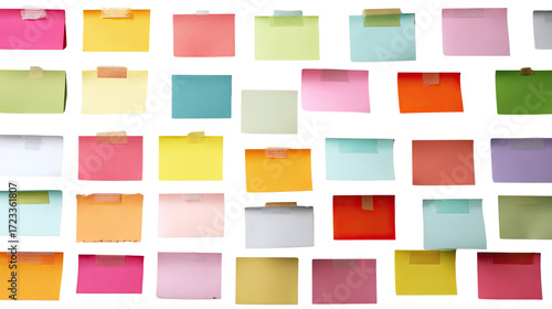 Multicolored Adhesive Sticky Notes Affixed with Clear Tape for Office Organization, Creative Planning, School and Business Reminders on white background