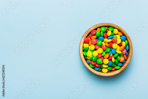 Multicolored candies in a bowl on a colored background. birthday and holiday concept. Top view with copy space