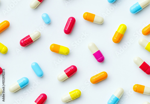 Multicolored capsules on white background. Seamless pattern of biological supplements, vitamins and medicines for health, beauty of skin and hair,biohack. Close-up for backgrounds, print and backdrops