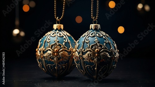 Multi-colored Christmas tree toys are laid out in a pyramid on a table with a dark background; the correct studio lighting is used as a composition