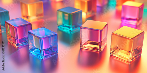 Multi-colored cubes made of translucent material, resting on a light metallic surface, with vivid reflections and bright, sharp highlights.