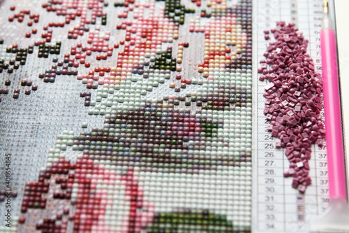 Multicolored Diamond Strases and Manual Fixer for handmade process of creation of diamond painting 3d
