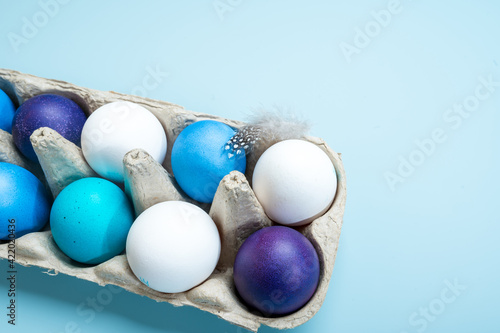 Multi-colored Easter eggs in an egg tray