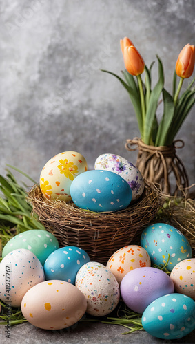 Multicolored Easter eggs on the table with spring flowers - Easter banner with a space for text. rustic Easter background.