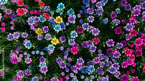 Multicolored Flower Background. Floral Wallpaper with Pink, Purple and Blue Roses. 3D Render