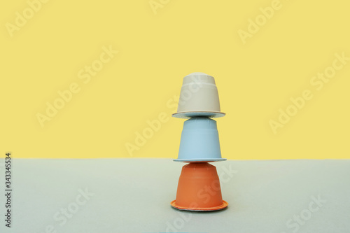 Multi-colored gray, beige and orange coffee capsules stand on top of each other like a pyramid on a gray yellow background