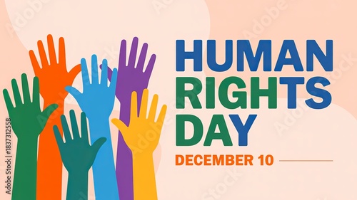 Multicolored hands symbolize freedom, dignity, justice, and worldwide human equality.