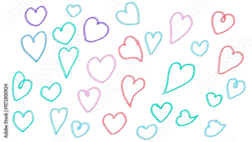 Multicolored hearts drawn with pencil, crayon on white background, illustration